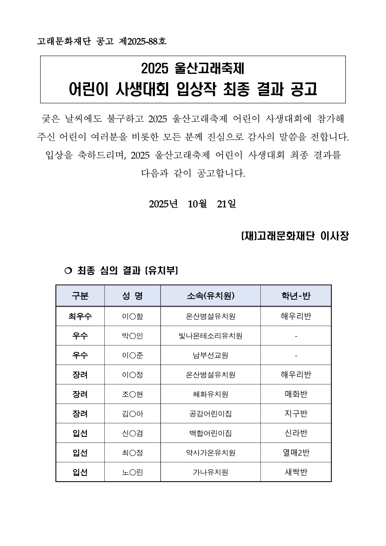2025 울산고래축제 어린이 사생대회 입상작 최종 결과 공고